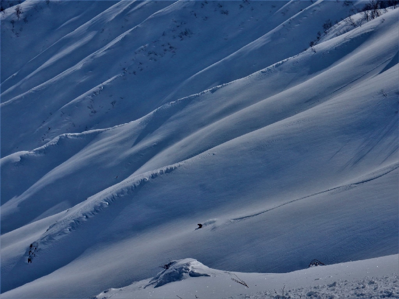 白馬連峰稜線も、小蓮華山から延びるひときわ目立つ沢がある。それが金山沢。実はそんな迫力ある沢横に、なんとも適度なうねりを伴った天然なパイプラインが存在っ!沢の深さもうねり具合も抜群なこの地形。そんな地形に身を任せ、重力に身を任せ永遠と滑り込む!途中、猿倉を通過し、その後はブナ林を白馬山麓まで…。冷静に考えてみよう、なんと滑走標高差は約1,800m?!!