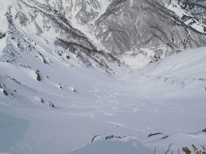 近年(2013年)、足を踏み入れられ始めたばかりの超マニアックエリア!唐松沢から不帰沢を詰め至る、行って初めて納得出来るルート。広く大きな沢底から見上げる光景には感動もの!なんと滑走標高差は1,800m!!